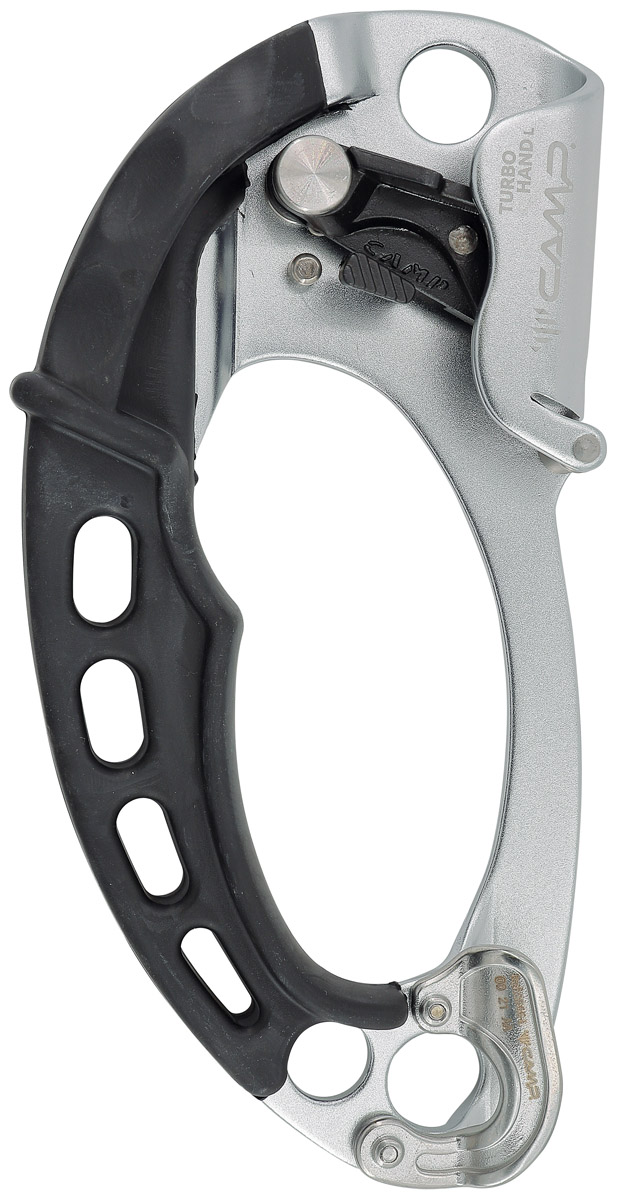Два широких отверстия для закрепления в нижней части рукоятки зажима дают возможность вщелкнуть два полноразмерных карабина для наиболее удобного расположения педали и уса.