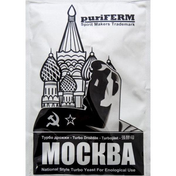 Турбо дрожжи Puriferm Москва это самые мощные и самые недорогие дрожжи от известного мирового производителя Hambleton Bard. При производстве этих турбо дрожжей используется уникальный штамм, который выживает и работает в высоко-спиртовой среде. Благодаря этому они могут переработать до 9 кг сахара и дать крепость браги до 21% алкоголя. Справляются с самыми сложными условиями брожения. В их состав входят все самые необходимые минералы, подкормки и микроэлементы. Благодаря блокаторам сивушных масел и вредных примесей готовый напиток получается невероятно чистым и мягким. Никакого неприятного запаха и аромата, только легкая «хлебная» органолептика и удивительно мягкий вкус. Данные дрожжи идеально подойдут как и опытным самогонщикам так и новичкам, ведь даже нарушая процесс перегонки очень сложно испортить готовый напиток на этих дрожжах. Турбо дрожжи Москва не нуждаются в разбраживании. Достаточно просто засыпать их в воду в которой растворен сахар. Идеальная температура воды при внесении 25-30 градусов. Гидрозатвор использовать не обязательно.